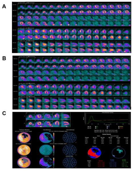 Images from the patient’s cardiac PET study: (A) Perfusion images, (B) Gated images, and (C) Myocardial blood flow. View the complete case.